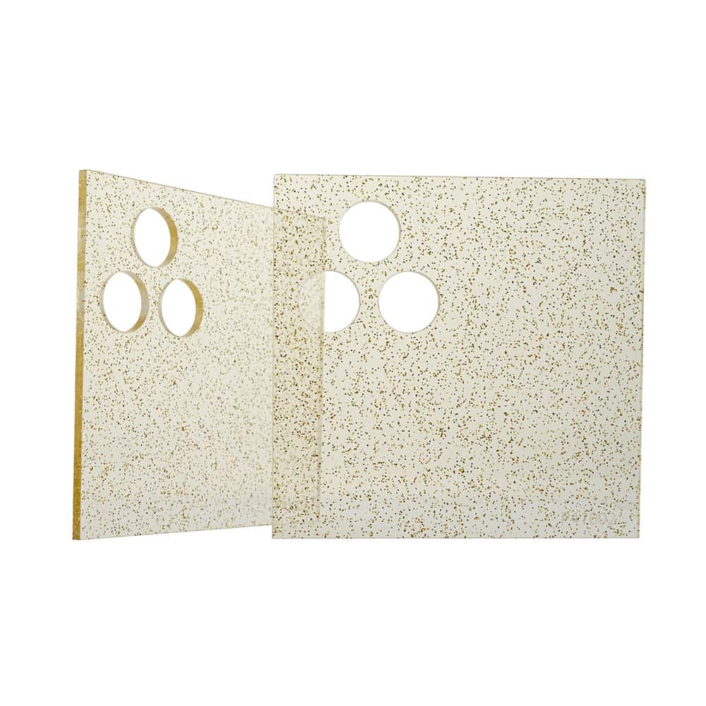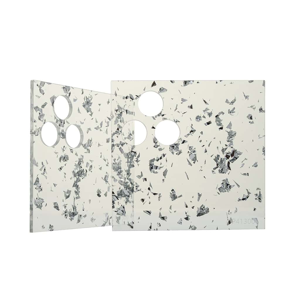 Glitter acrylic colours are easy and precise to work with. You can saw, mill, laser cut, hot bend, vacuum form, glue, drill, facet, polish, matt or print it.